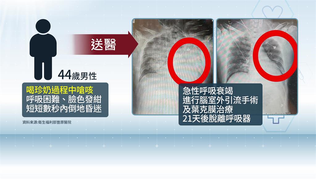 香濃有嚼勁的珍珠奶茶深受民眾喜愛,但有人喝到一半嗆到,竟裝上葉克膜送醫!台中一名44歲男子在家喝珍珠奶茶,突然劇烈嗆咳,演變為呼吸困難、臉色發紺,在短短數秒內倒地昏迷,家人立即將他送醫。檢查後發現男子急性呼吸衰竭,要裝上葉克膜治療,幸好21天後脫離呼吸器,返家休養。
