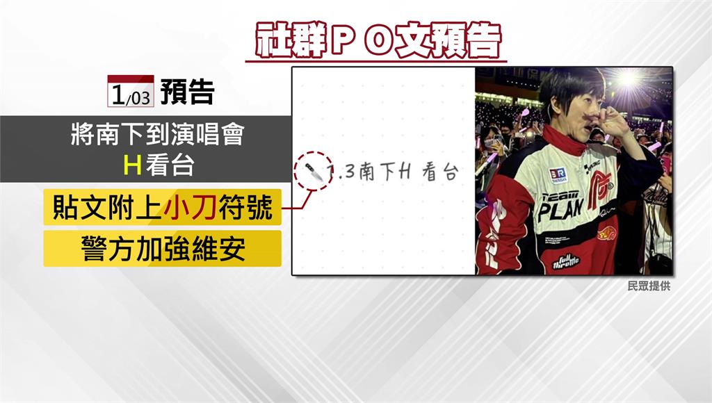 有網友在社群平台小紅書發文,預告將在1月3號演唱會南下到H區看台,最後附上小刀的圖案,還標記了五月天,警方收到情資後也高度重視,入場時除了進行嚴格安檢外,也提升維安。