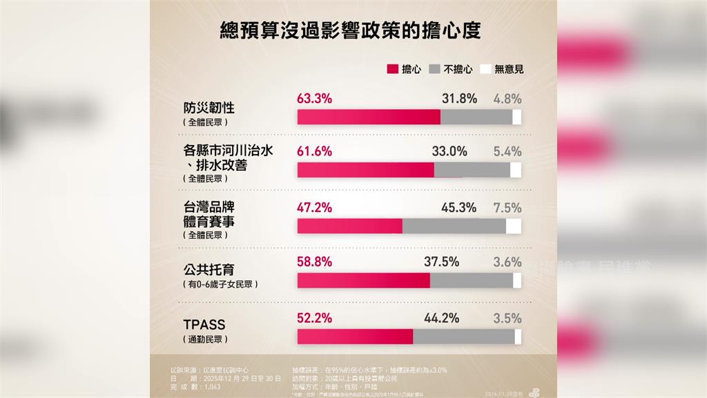 民進黨內部釋出民調。圖/翻攝自FB@民進黨民進黨內部釋出民調,調查時間12月29日至12月30日,針對立法院沒有通過總預算,在防災韌性和排水治水方面都有破六成民眾很擔憂;另外,在公托和TPASS部分,也有超過半數的民眾表示擔憂。