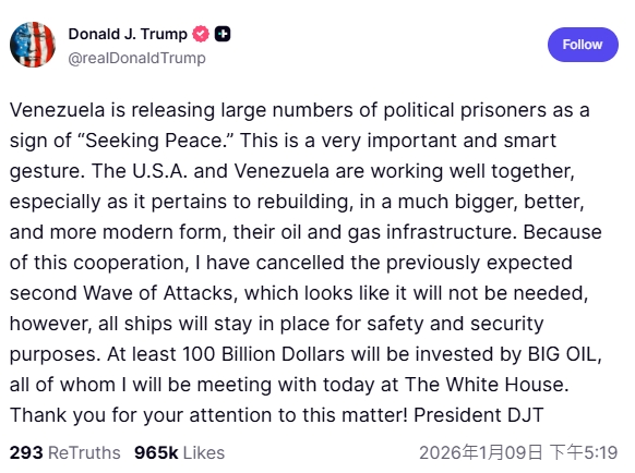 川普在自家社群平台發文,指出委內瑞拉正釋放大量政治犯,以此示好「尋求和平」,稱讚這是一個非常重要且明智的舉動。川普也提到,目前兩國合作非常順利,「尤其是在以更大、更好、更現代化的方式重建其石油和天然氣基礎設施方面」。