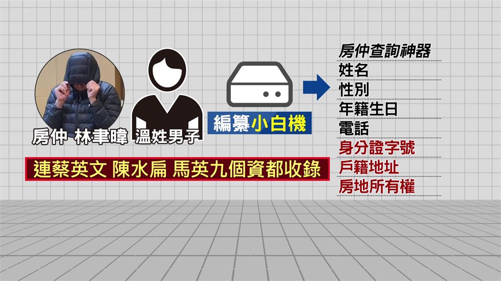 據了解,林聿暐約5年前曾與一名溫姓前房仲勾結,將蒐集到的個資彙整成搜尋系統,製作號稱房仲查詢神器的「小白機」,可查詢姓名、性別、戶籍地址、房地所有權等資料,當時涉及個資達1億7千多萬筆,其中也包含蔡英文、馬英九、陳水扁等人的資料。