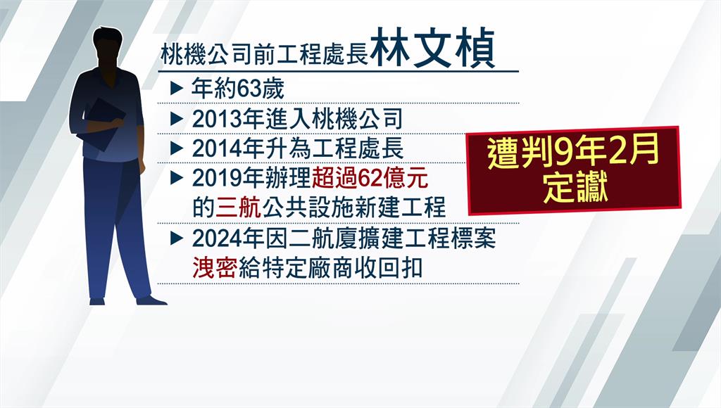 年約63歲的林文楨,2013年進入桃園國際機場公司,隔年升任工程處長,前年他因在第二航廈擴建工程中,將標案資訊洩漏給特定廠商並收取回扣,遭法院判9年2月定讞。