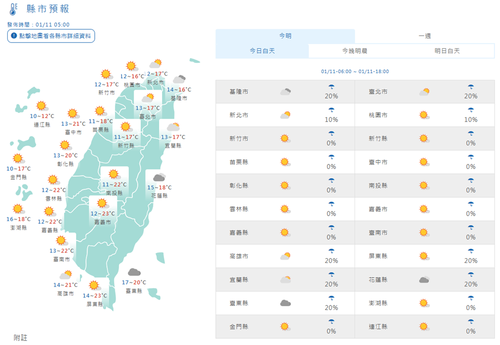 氣象署指出,今天中部以北及宜蘭低溫普遍為9至11度,其他地區在12至15度;白天氣溫回升,北部及宜蘭、花蓮高溫約19、20度,其他地區22至24度,而到了晚上至明天,大陸冷氣團南下及影響,北部及宜蘭整天又會變得比較偏冷,其他地區早晚也冷,西半部及宜蘭低溫普遍約11至13度,其他地區在15度左右;離島天氣,澎湖晴時多雲,16至18度,金門晴時多雲,10至17度,馬祖晴時多雲,9至12度。
