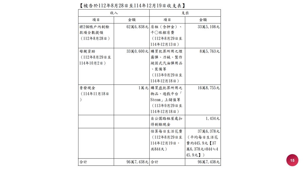 台北地檢署主任檢察官曾揚嶺指出,張文自109年起資金來源僅來自於母親及其薪資所得等,總金額共198萬6961元,查無其他不明資金來源,且被告自112年8月28日將中華郵政及元大銀行帳戶內款項全數提領後,在114年12月19日案發前,統計被告可動用資金共計有96萬7438元,其中也包含政府普發的現金1萬元。
