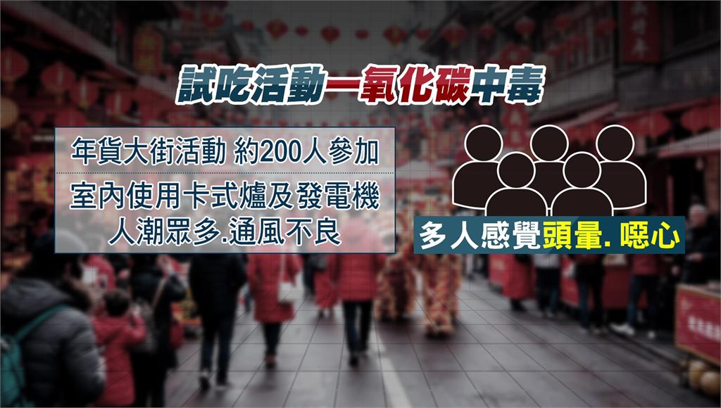 試吃活動一氧化碳中毒。圖/台視新聞製圖消防局於下午3時05分接獲通報後,立即派員前往處理,疏散現場約200人並進行通風。經檢傷評估,共有13人送醫治療,其中年齡最小為9歲男童,最大為74歲婦人,分別送往松山三總、台安醫院及國泰醫院,所幸皆意識清楚,無生命危險。