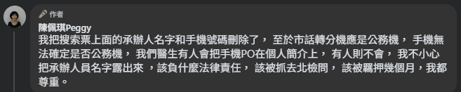 陳佩琪事後發現照片資訊不妥,隨即編輯貼文,表示已將承辦人姓名與手機號碼刪除,並稱是不小心露出。她說,「該負什麼法律責任、該被抓去問、該被羈押幾個月,『我都尊重』。」