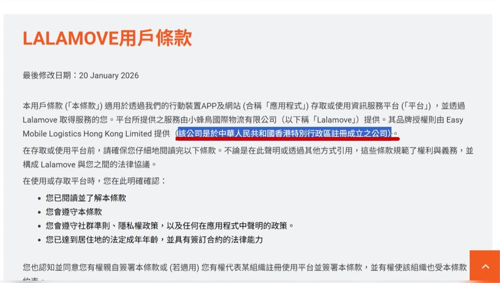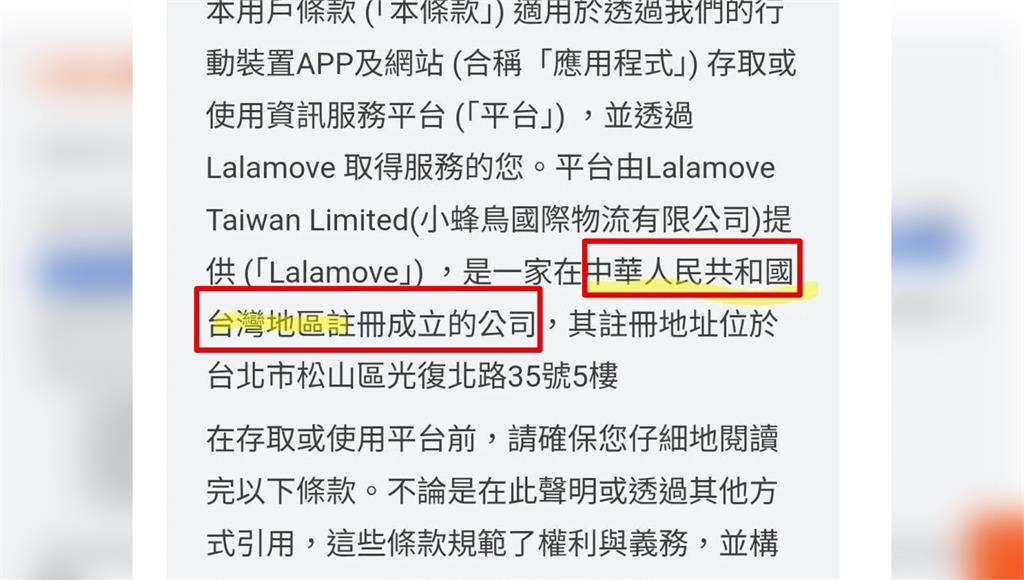 一名網友發現,Lalamove在用戶條款中,自稱是「中華人民共和國台灣地區」註冊成立的公司,曝光後,網友們怒轟,「演都不演了,直接幫中共統戰」、「連台胞證申請表也不敢這麼大刺刺的踩踏台灣主權」、「這種公司直接滾出台灣吧」。