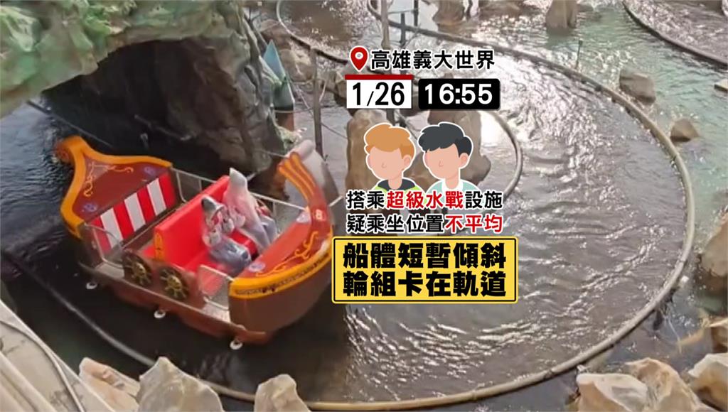 高雄義大遊樂世界園區內的「超級水戰」設施,有兩名小朋友搭乘時疑似乘坐位置不平均,導致船體傾斜、輪組卡在軌道上停擺。小朋友們被困在船上,眼看另一艘船即將開過來撞上,趕緊向路過民眾揮手,還比出「540」求救手勢。好在有工作人員下水協助,約5分鐘後解救這兩名孩童。