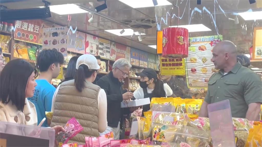 輝達執行長黃仁勳訪台行程進入第三天,今(31)天身穿一件黑色外套再度走入台北街頭,下午現身四平商圈的蜜餞行,仍然展現親民的作風,頻頻與店家、民眾互動,手拿蜜餞和店家輕鬆聊天,看到民眾來拍照也非常開心地回應,拍照簽名來者不拒,還親切地買芒果乾送給旁邊的小朋友,展現十足的台灣味。