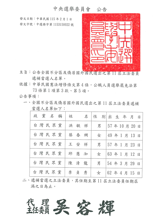 中選會公告「全國不分區及僑居國外國民選出之第11屆立法委員遞補當選人名單」。圖/翻攝自中選會官網