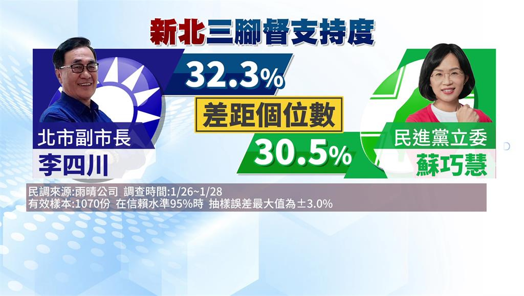 根據最新民調,李四川、蘇巧慧支持度分別為32.3%和30.5%。圖/台視新聞近期也傳出蘇巧慧租下2022年市長侯友宜高票連任的板橋場地,作為競選辦公室,蘇巧慧本人也再次澄清,此地只是夥伴們一起討論事情、開會的地方,若找到適當地點做競選總部,一定會跟大家報告。