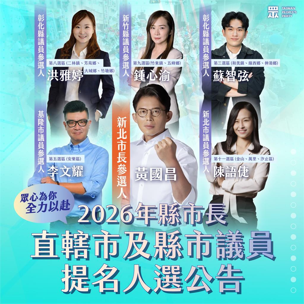 除了黃國昌,民眾黨同時也公布,核定選決會通過的2026年直轄市、縣市新一波議員提名名單,分別是基隆市安樂區李文耀、新北市金山萬里汐止區陳語倢、新竹縣竹東五峰選區鍾心渝、彰化縣和美線西伸港選區蘇智弦、彰化縣二林芳苑大城竹塘選區洪雅婷。