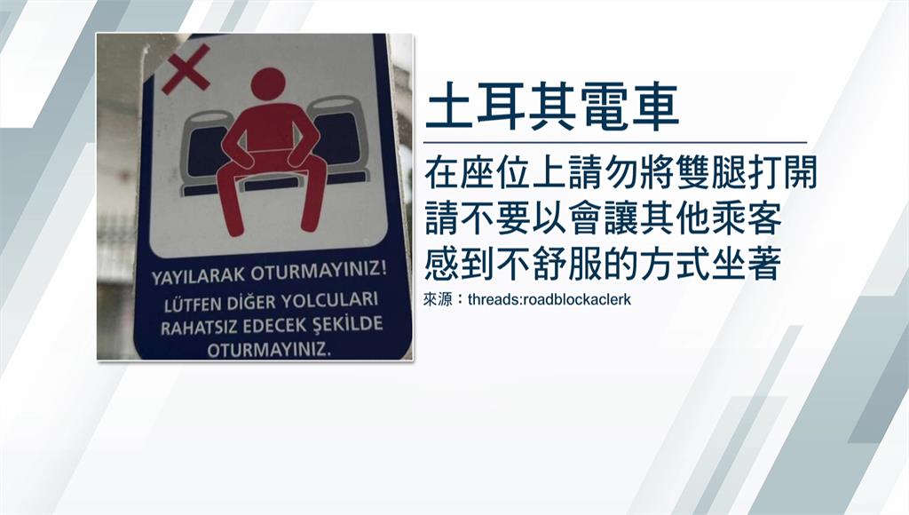 搭乘大眾運輸工具時,有些人坐姿比較放鬆,會把雙腿張開,但這行為可能影響鄰座乘客。而在土耳其電車上,這項行為已被明文禁止,公告圖示可見,一名乘客雙腿大張,幾乎占據三個座位,旁邊標示醒目的紅色叉號,下方並以土耳其文寫著「在座位上請勿將雙腿打開,請不要以會讓其他乘客感到不舒服的方式坐著。」