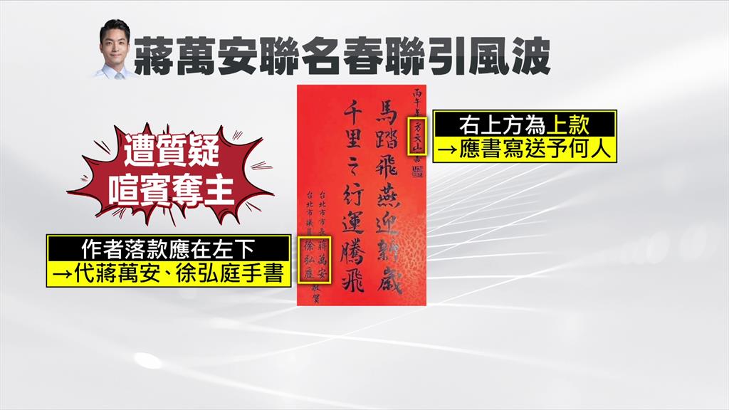 蔣萬安先前聯手熊讚推出馬年春聯「今馬熊讚」,但沒想到聯名藍營議員徐弘庭的另一款春聯卻惹出風波。兩人聯名的春聯寫下「馬踏飛燕迎新歲、千里之行運騰飛」,更找來知名作詞人方文山書寫,只是第一句「馬踏飛燕」這四個字,正逢選舉年也引發外界聯想,認為是否在暗指台中市長盧秀燕。