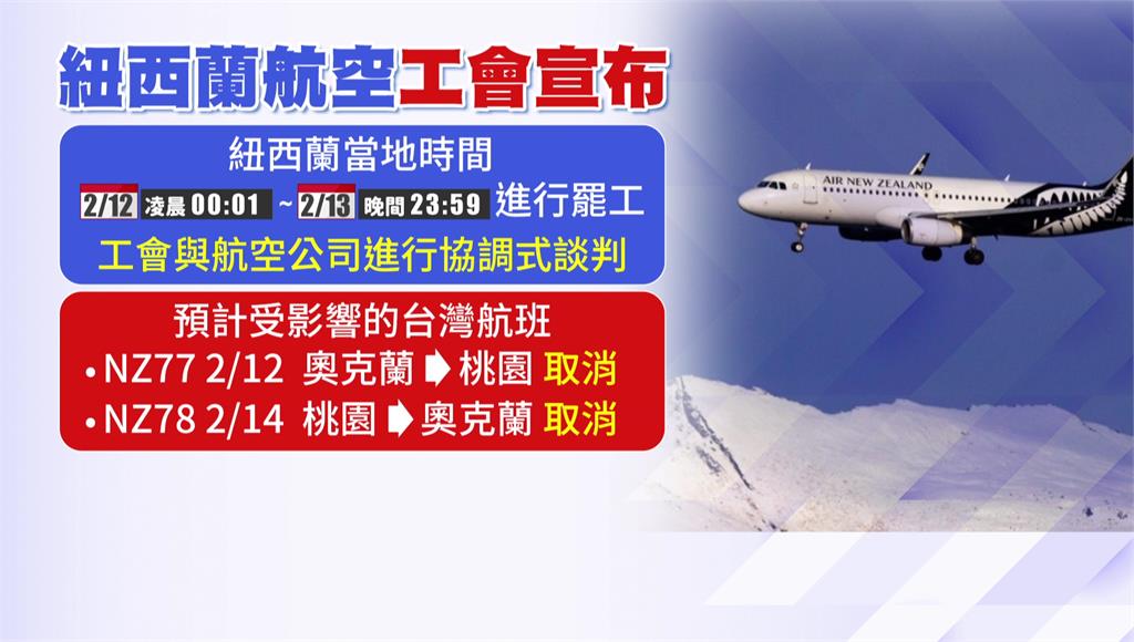 受影響遭到取消的台灣航班,包括2月12號和2月14號桃園往返奧克蘭的航班,買了套裝行程準備出發的團客恐受影響,旅行社急著找備案,可能縮短旅遊天數,或找尋轉機方案提前出發。