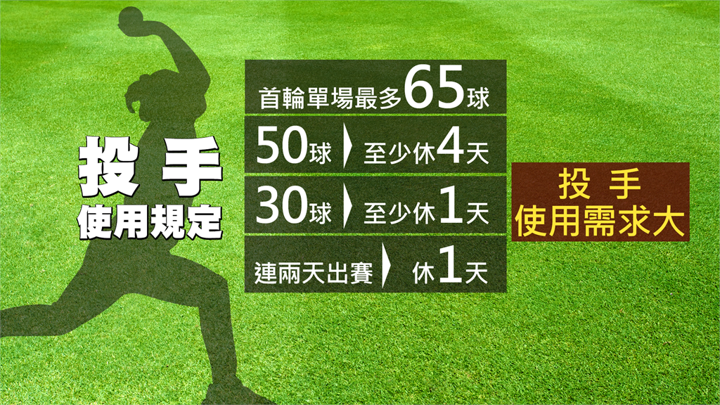 攤開投手使用規定,首輪單場最多投65球,超過50球需休四天、超過30球需休一天,連兩天出賽也要休息,再加上旅外投手多半有球數限制,因此對於投手的使用需求大。