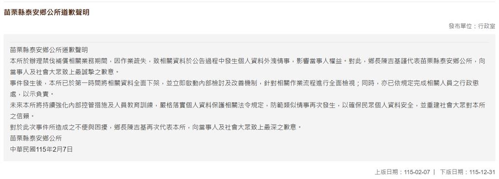 泰安鄉公所發出道歉聲明,稱在辦理禁伐補償相關業務期間,因作業疏失,導致相關資料於公告過程中發生個人資料外洩情事,影響當事人權益,鄉長陳吉基代表苗栗縣泰安鄉公所向當事人及社會大眾致上最誠摯之歉意。