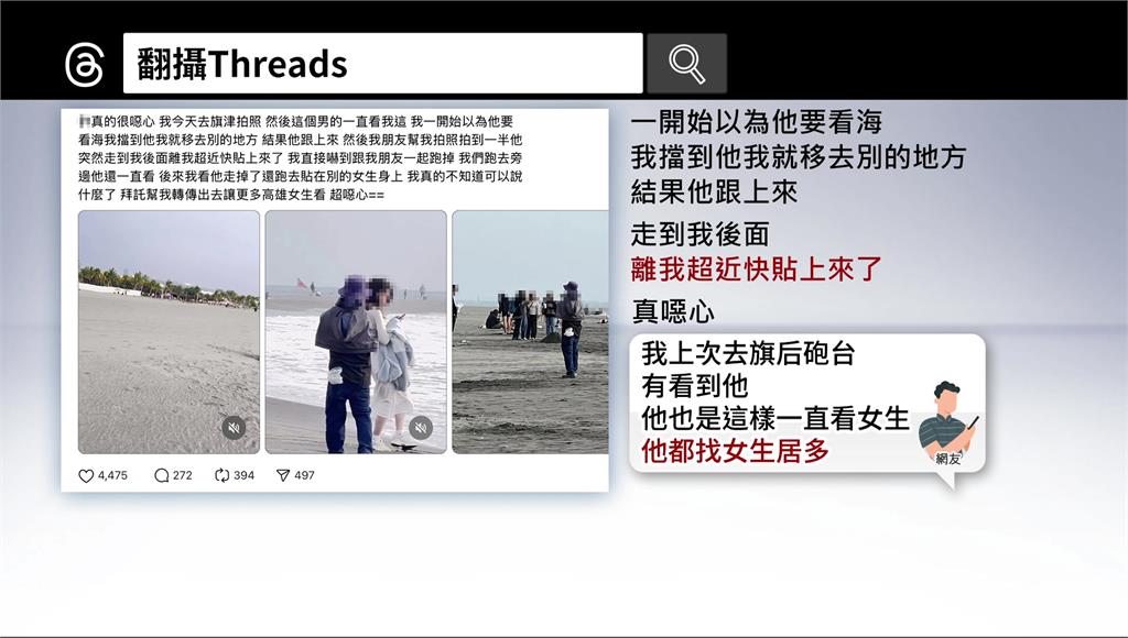 男子不斷靠近女生,甚至貼在她背後。圖/翻攝自Threads@u_1.13_有女子表示,起初以為男子只是想看海,誤以為自己擋到視線,因此主動移動位置,沒想到對方竟一路跟上,且距離相當靠近,讓她感到極度不適。