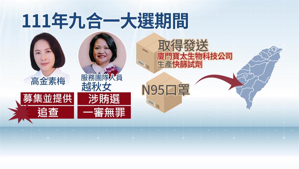 調查發現,民國111年九合一大選期間,高金素梅底下的服務團隊人員越秋女,取得中國製的快篩試劑還有N95口罩,到處發送。越秋女後來選上屏東縣議員,被指控涉嫌賄選,但一審認定沒有對價關係無罪。但國安站懷疑,幫忙募集並提供這些物資的高金素梅可能涉及中資,全面追查。