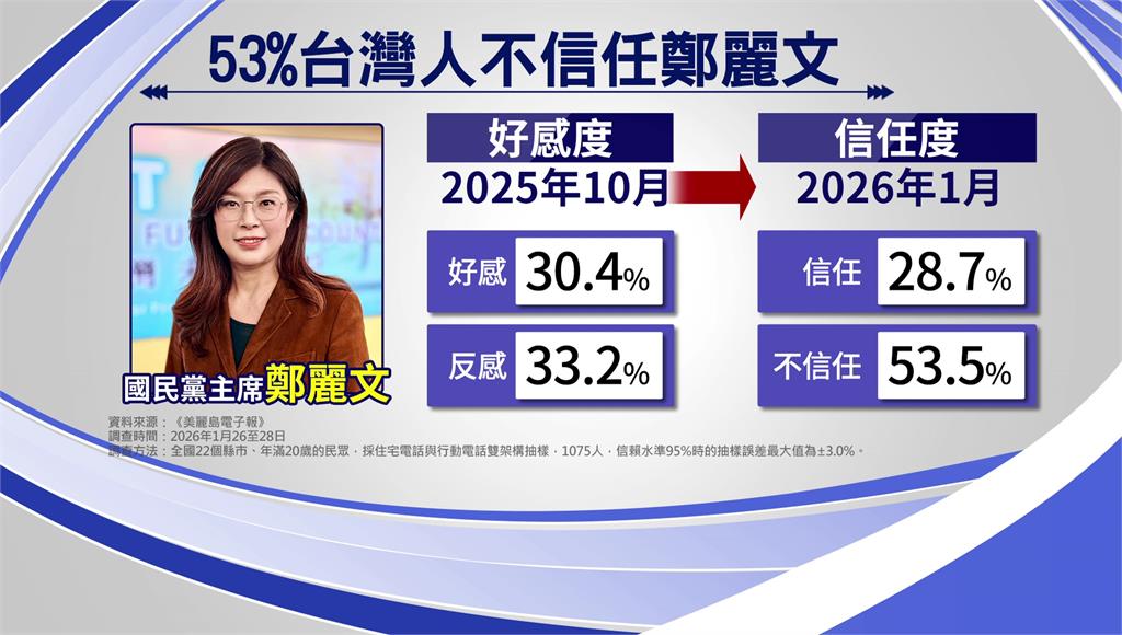 根據《美麗島電子報》最新民調,鄭麗文去年10月剛當選時,好感度約三成,但僅過三個月,不信任度已高達53%,藍營黨內因此傳出退黨潮,並指3月可能成為關鍵時間點。