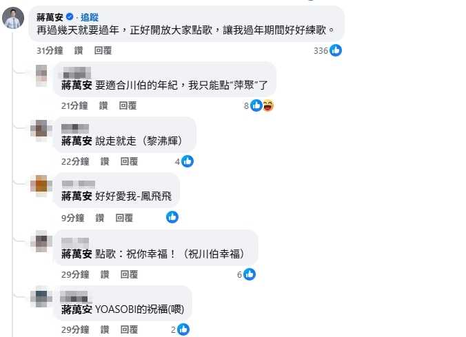 今(11)天李四川在臉書發文宣布2月底請辭的貼文,蔣萬安在底下留言回應,「再過幾天就要過年,正好開放大家點歌,讓我過年期間好好練歌」。