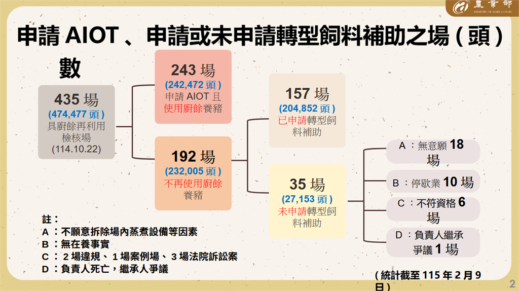農業部說明,啟動廚餘養豬轉型計劃前原有435場廚餘養豬場,在中央與地方相關環保及農業主管機關協力推動下,截至115年1月31日止,已有243場養豬場完成AIOT溫度監控設備建置,並經納管得使用廚餘養豬最晚至115年12月31日止;另有157場已申請轉型飼料補助,由政府協助轉用飼料養豬。