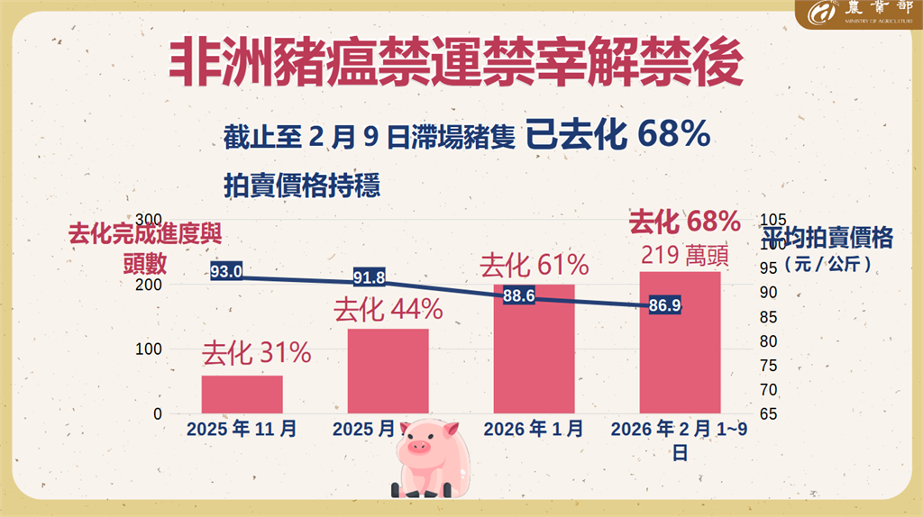 農業部指出,解禁後啟動毛豬產銷調節方案,目前滯留豬隻去化進度達68%、情形良好,肉品市場交易秩序及價格維持穩定,國產豬肉民生供應無虞。農業部說,後續政府將持續加強稽查,防杜非法使用廚餘,確保養豬產業平順轉型。