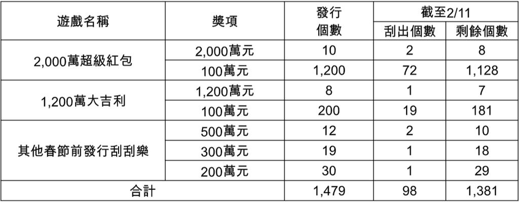 根據台彩公布資料,截至2月11日,新春限定刮刮樂「2000萬超級紅包」已刮出2個2000萬頭獎,尚有8個頭獎機會;100萬元獎項已刮出72個,剩餘1128個中獎機會。