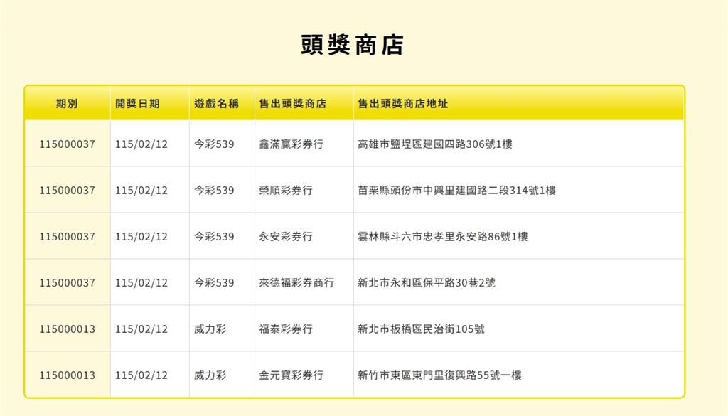 本期開出頭獎彩券行。圖/台彩台彩2/12獎項獎號如下: