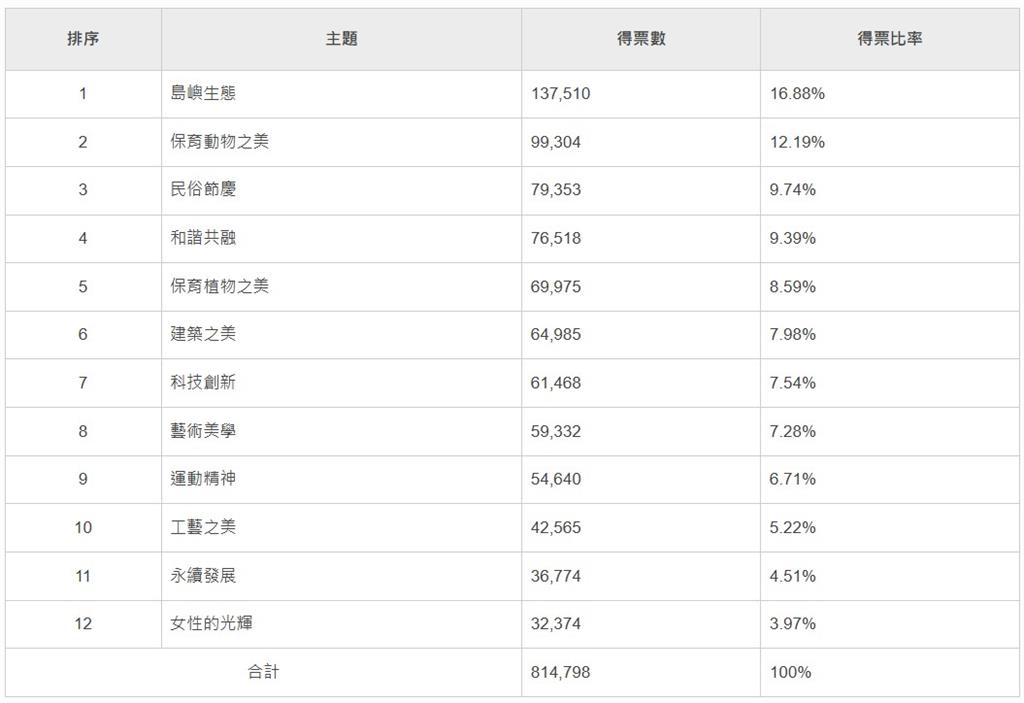 「台灣之美」新台幣改版票選結果出爐。圖/台視新聞(資料畫面) 中央銀行辦理的「台灣之美」系列鈔券面額主題票選活動,已於今(13)日下午17點順利結束,累積總投票數達19萬2959人次,充分展現國人對新版鈔券的高度期待與參與熱忱,其中以主題「島嶼生態」得票率16.88%最高,最終以13萬7510票拿下第一。央行表示,相關票選結果將納入專業判斷及整體考量,作為新版鈔券設計的重要參考。12項面額主題得票數與得票比率。圖/翻攝自中央銀行官網責任編輯/馮康蕙
