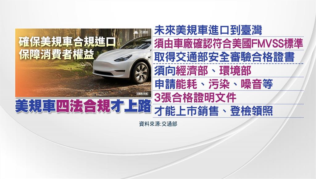 未來美規車需四法合規才能上路。圖/台視新聞至於國產車是否因此受衝擊,專家表示,國產車價位約落在50萬到100萬元之間,除非進口車大幅降價,否則國產平價車市場,短期內仍具備一定的防禦力。