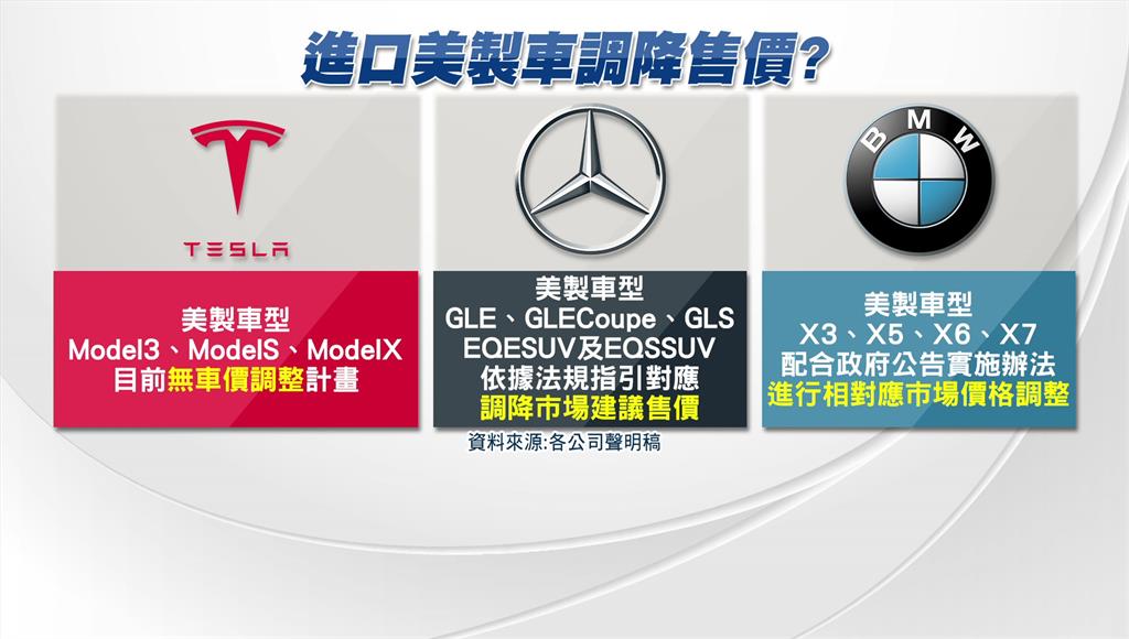 消費者終於迎來,進口車降價的一天,尤其熱門車款,比如Tesla旗下的,Model 3、Model S及Model X,但Tesla Taiwan回應,在相關法規還完全明朗、正式生效前,目前並無車價調整計畫。賓士則率先開出第一槍,宣布5款美製車型,會依據法規調降市場建議售價;BMW也跟進,表示4款在美國生產的X系列休旅車型有調價空間。