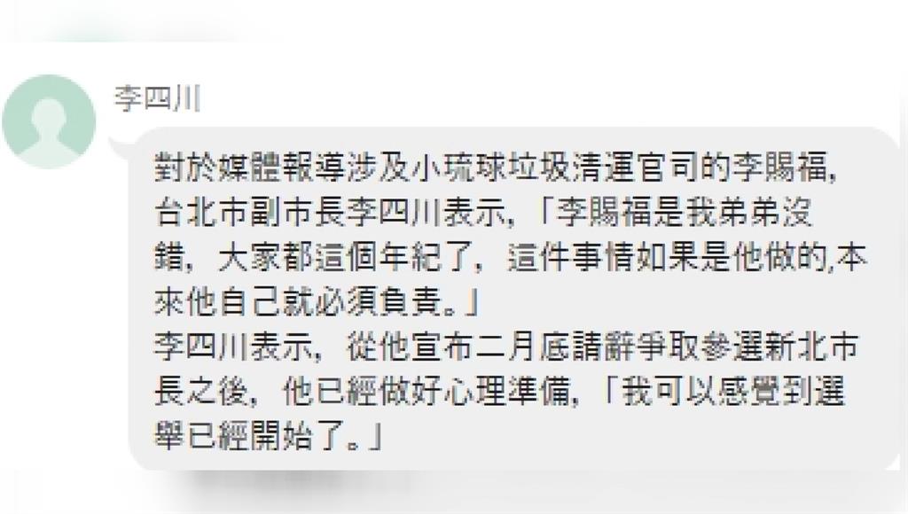 小琉球恐嚇清運業者的主嫌李賜福。圖/台視新聞網紅四叉貓更在網路曝光他與李四川的兄弟關係,引發網上熱烈討論。面對親弟司法案件,李四川在媒體群組發聲,證實李賜福就是自己弟弟,但強調這個年紀,這件事情若是他做的,本來就得自己負責。李四川也提到,自己宣布請辭爭取參選新北市長後,就已經做好心理準備,直呼「可以感覺到選舉已經開始」。