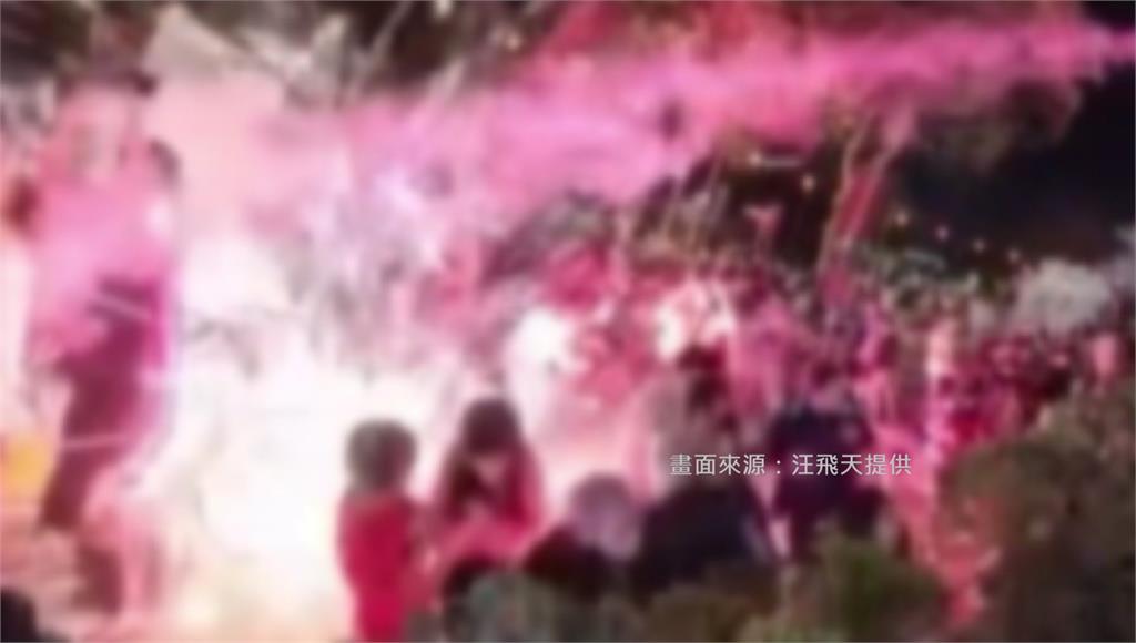 落焰射向人群炸開。圖/汪飛天提供畫面PO網也引起網友質疑,廟方安全規畫是否不足。對此,高雄消防局解釋,廟方的煙火施放地點均符合安全距離規範,但落焰卻炸向人群,消防局推測,很可能是施放方向改變,加上風勢釀禍。
