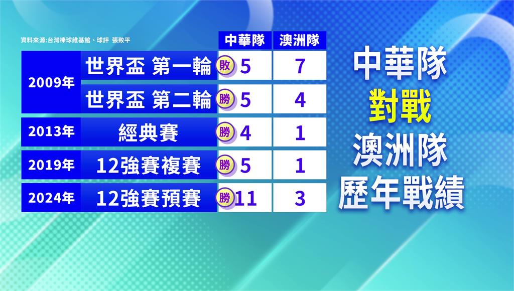 中華隊對戰澳洲隊歷年戰績。圖/台視新聞有球評指出,澳洲本屆30人名單中,投手多為澳職體系出身,打線上有長打能力的打者不在少數,因此中華隊投手群布局備受關注,球評認為若調整狀況理想,首位登場的先發投手將可能由古林睿煬、徐若熙、林昱珉其中一人擔任。