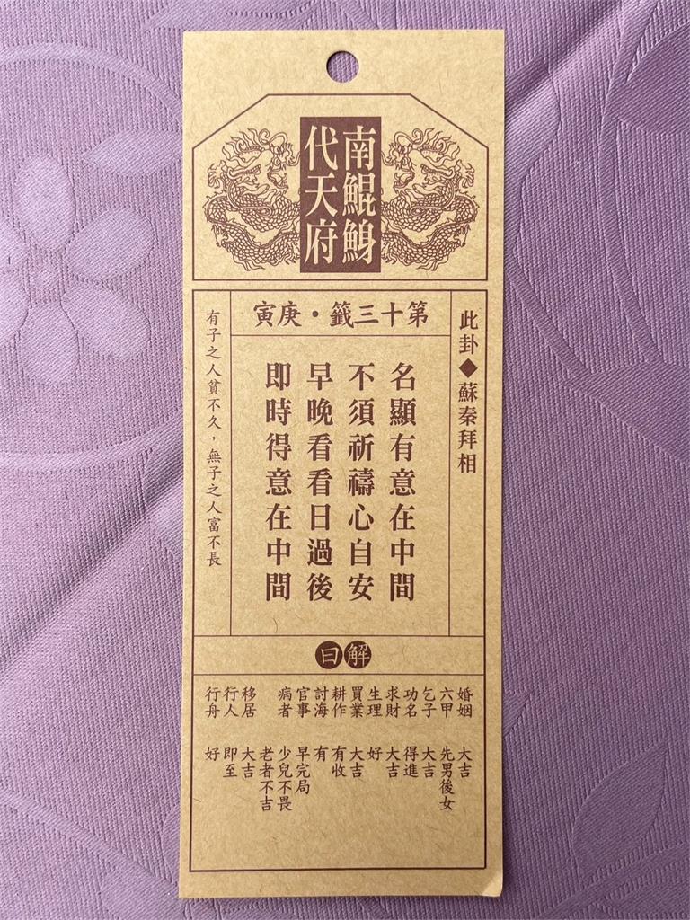 擲筊確認、過程嚴謹,台南北門南鯤鯓代天府抽出馬年國運籤,抽出第十三籤「蘇秦拜相」,籤詩內容為「名顯有意在中間/不須祈禱心自安/早晚看看日過後/即時得意在中間」,從字面上看是中上上籤。