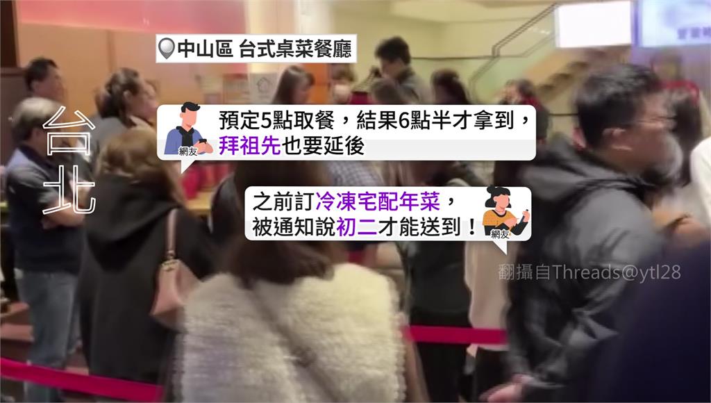 有客人表示,過去多年都訂這家餐廳的年菜,今年改到另一間分店取貨,原本預定下午五點取餐,卻等到六點半才拿到,導致拜祖先時間延遲。也有人指出,曾訂冷凍宅配年菜,但店家通知要到初二才能送達。