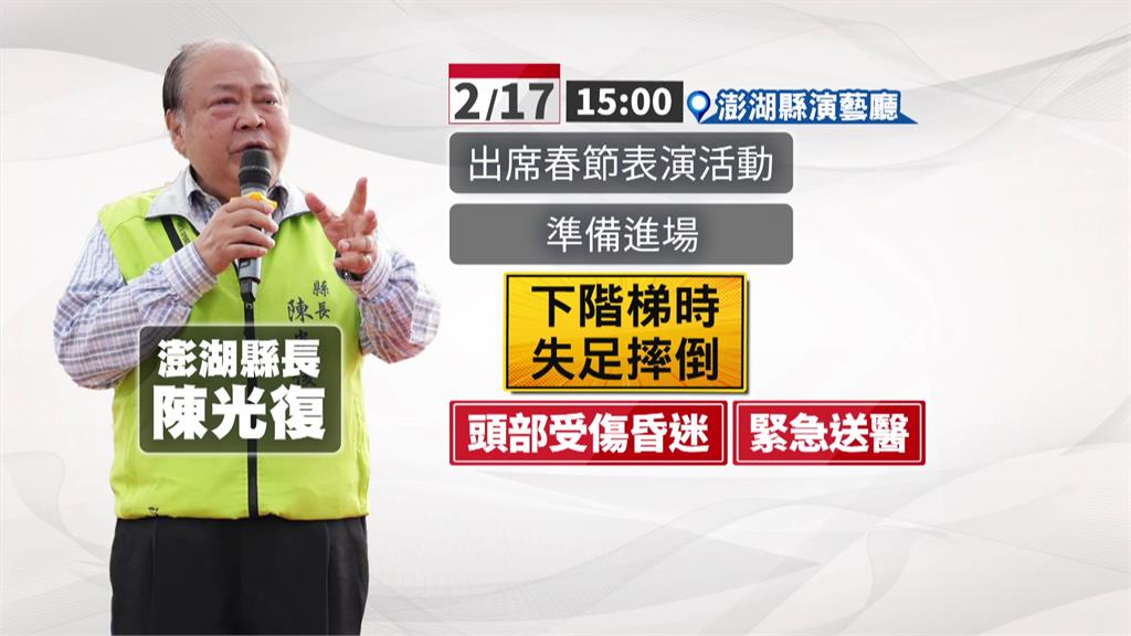 澎湖縣長陳光復大年初一(17日)下午出席劇場活動時意外從階梯摔落,頭部重創昏迷,經搶救後恢復生命徵象,隨後由直升機後送至高雄榮總緊急接受顱內手術。醫師指出,接下來一週是關鍵期,引發外界關注。