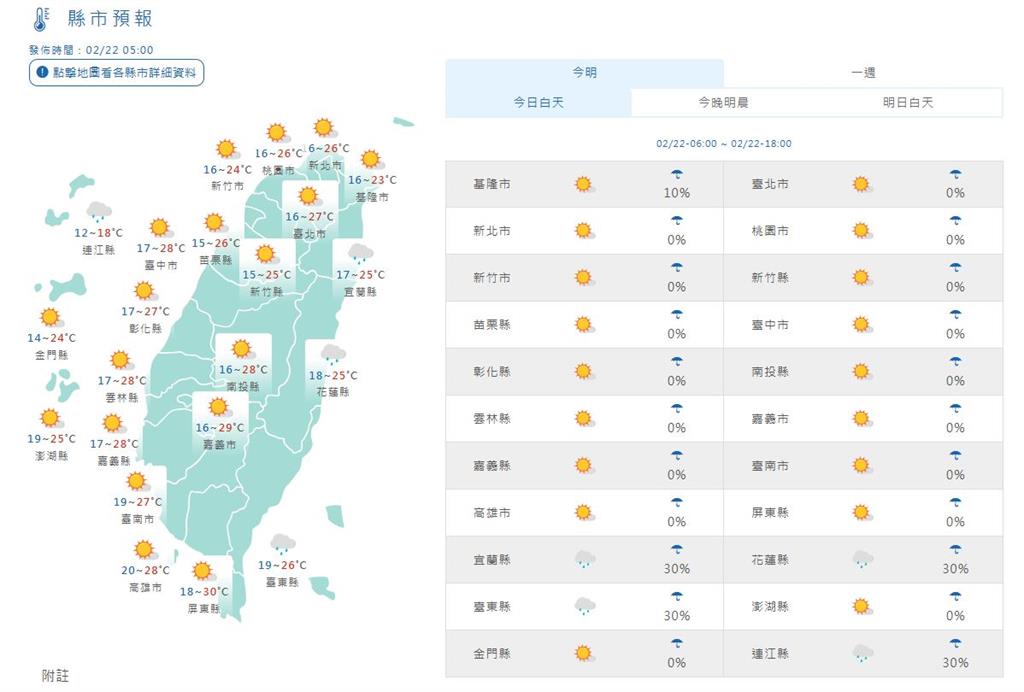 收假日迎接好天氣,今(22)日初六全台多為晴天,僅部分地區有短暫雨,高溫大約25-30度,各地早晚仍涼,而馬祖易有低雲或局部霧影響能見度。不過下週三(25日)鋒面掠過、北臺轉為濕涼,下週四(26日)又有另一鋒面逐漸接近。