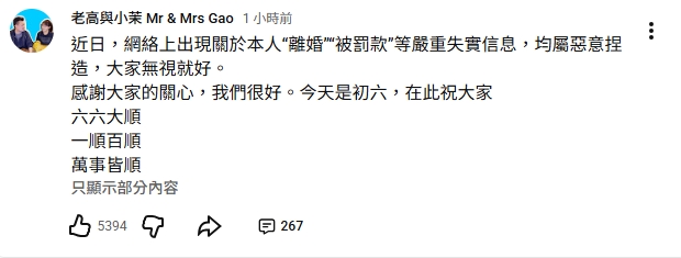 消息瘋傳一天後,老高也火速發聲澄清,強調關於本人「離婚」、「被罰款」等資訊均屬惡意捏造,要大家無視就好,「感謝大家的關心,我們很好。今天是初六,在此祝大家六六大順、一順百順、萬事皆順」。