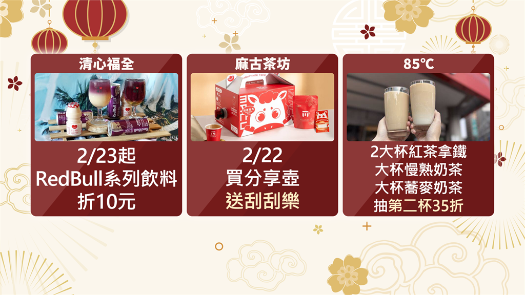 除了超商,台灣人最愛的手搖飲也要搶開工商機,像是清心福全把能量飲料加入紅茶或多多裡,變身提神的手搖飲,開工日推出系列飲料折10元;麻古茶坊最後收心日還可以試試手氣,買分享壺就送刮刮樂;85℃則是三款奶茶祭出第二杯35折。