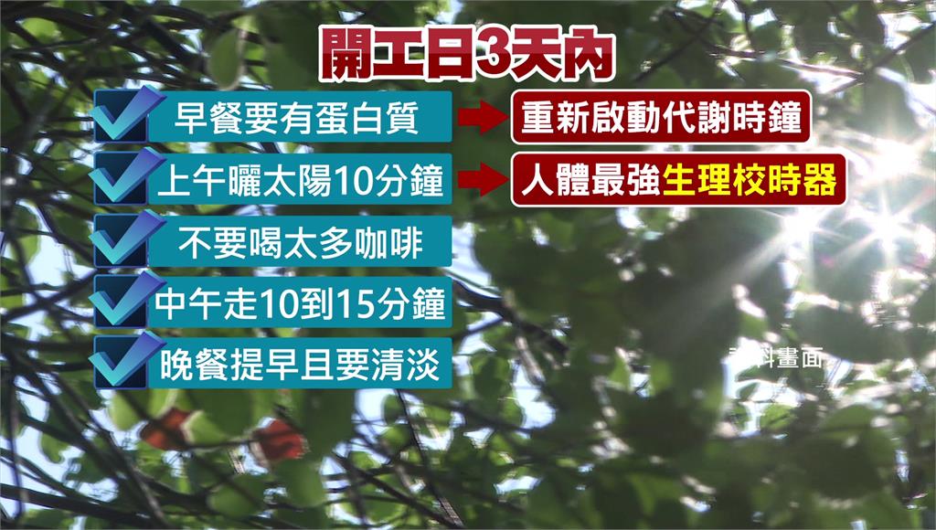 老闆低調受訪,但心情輕鬆愉悅,畢竟對一般上班族來說,開工日要調回作息總覺得頭腦昏沉沒精神,有醫師建議,在開工3天內要做好5件事,像是早餐要有蛋白質,改吃蛋、豆漿、優格,重啟代謝時鐘,還要曬個10分鐘太陽,不要喝太多咖啡,才能盡速讓身體重新回到正常軌道。