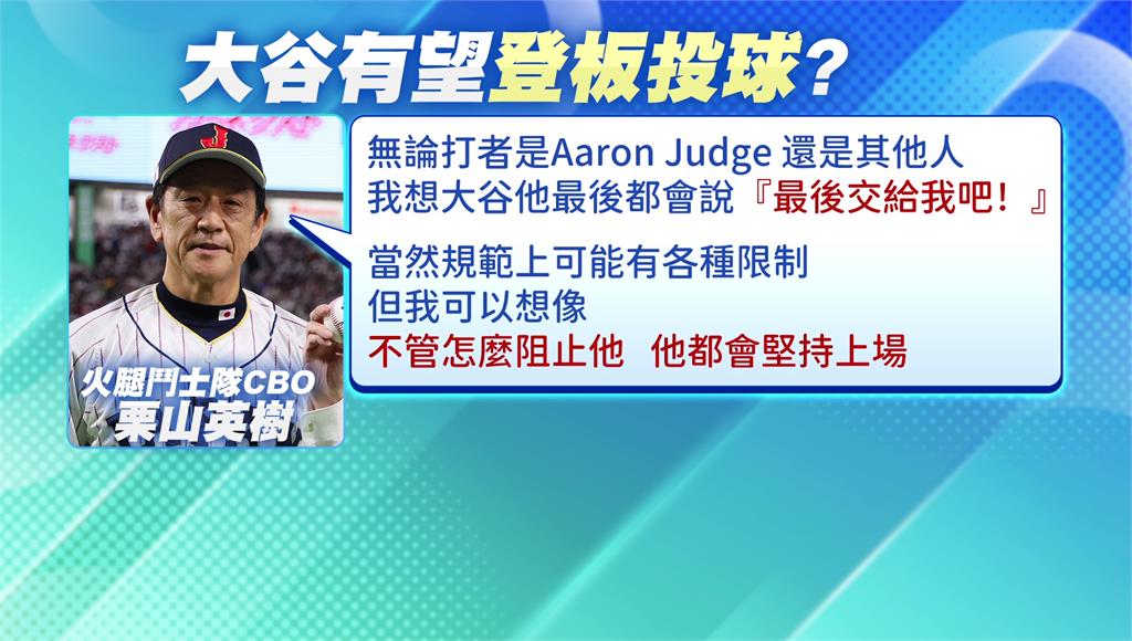 栗山指出,在關鍵時刻無論打者是Aaron Judge還是其他人,大谷一定會說「最後交給我吧」,雖然規範上可能有各種限制,但以他對大谷的了解,不管怎麼阻止他,他都會堅持上場。