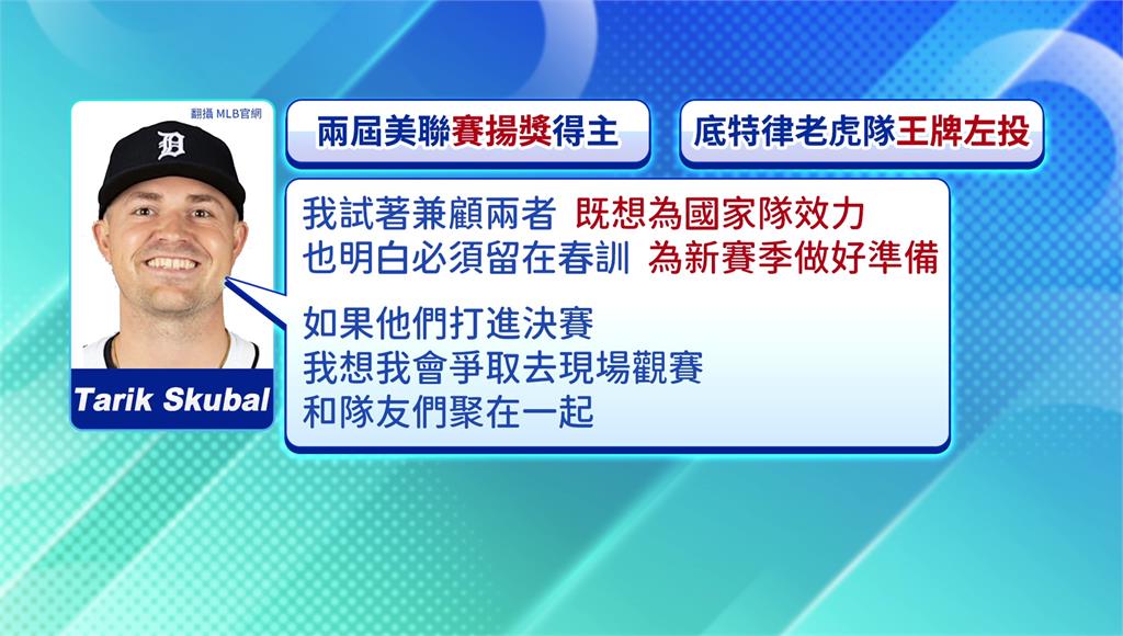 美國隊王牌投手史庫柏則是表態,本屆賽會他只為美國出賽一場就完成本屆任務,史庫柏坦言他既想為國家效力,也想與母隊老虎隊隊友一起春訓做新賽季準備,因此他會試著兼顧兩邊,到時候如果美國隊打進決賽,再爭取去現場觀賽。