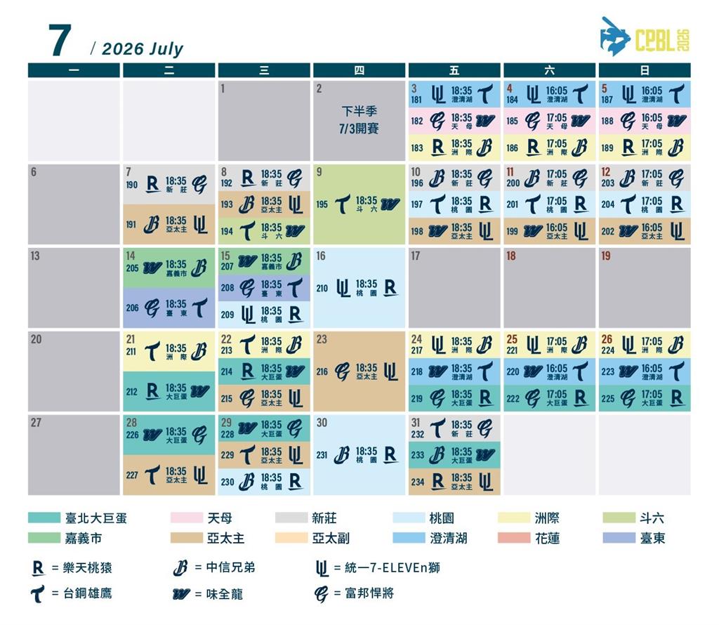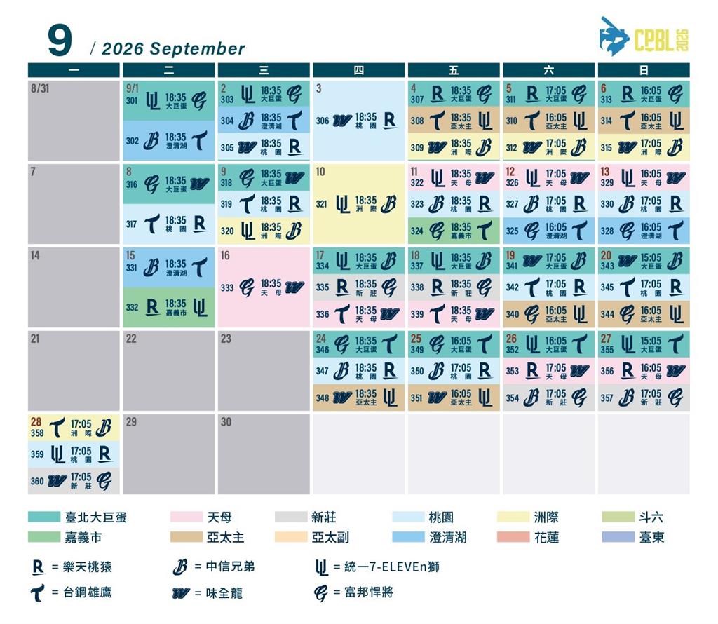 中華職棒37年新球季將於3月28日正式開打。圖/中職提供 中華職棒37年賽季即將到來,全新球季將於3月28日正式開打,一軍例行賽共安排360場比賽,於全台11座球場舉行,其中,臺北大巨蛋58場,亞太主球場也正式啟用一軍例行賽,安排48場賽事,勢必為新球季增添嶄新話題,另外花東也有8場賽事。中職說明,今年例行賽使用的11座球場與場次分配為,臺北大巨蛋58場、天母球場40場、新莊球場50場、樂天桃園球場52場、洲際球場47場、斗六球場2場、亞太主球場48場、澄清湖球場45場、花蓮球場2場、台東球場6場。3月28日開幕賽由樂天桃猿與中信兄弟在臺北大巨蛋交鋒,揭開中職37年序幕;開幕戰後,3月29日將進行「一日三地」賽事。臺北大巨蛋由樂天桃猿續任主隊迎戰味全龍;中信兄弟則在洲際球場舉行主場開幕戰,對手為富邦悍將;統一7-ELEVEN獅於亞太主球場進行主場首戰,迎戰台鋼雄鷹。3月31日,樂天桃猿返回桃園主場,在樂天桃園棒球場對決台鋼雄鷹。4月3日,新莊球場主場首戰由富邦悍將迎戰樂天桃猿;同日,味全龍於天母球場進行主場首戰,對手為台鋼雄鷹。4月6日,高雄澄清湖棒球場也將迎來主場開幕戰,由台鋼雄鷹對戰統一7-ELEVEN獅。嘉義市立棒球場本季首戰將則於4月22日登場,由台鋼雄鷹擔任主隊迎戰味全龍。5月19、20日花蓮球場安排兩場賽事,味全龍與台鋼雄鷹將為花蓮球迷帶來精彩對決。斗六球場賽事則於下半季展開,7月8、9日同樣由味全龍與台鋼雄鷹交手。台東球場於7月14、15日迎來系列戰,由台鋼雄鷹擔任主隊迎戰富邦悍將,點燃台東棒球熱情。【中華職棒37年例行賽完整賽程表】責任編輯/陳盈真