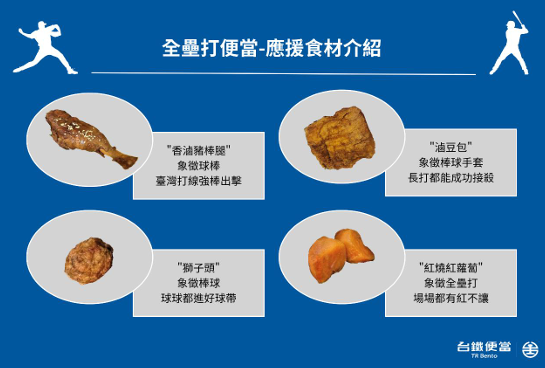 台鐵說明,「全壘打便當」菜色包括,兩支腱子骨製成「香滷豬棒腿」,象徵「球棒」寓意「台灣打線強棒出擊」,扎實飽滿的「獅子頭」則象徵「棒球」寓意「球球都進好球帶」,醬香濃郁的「滷豆包」象徵「棒球手套」寓意「長打都能接殺成功」,鹹香入味的「紅燒紅蘿蔔」象徵「全壘打」寓意「場場都能紅不讓」,另搭配有兩道清脆爽口的季節時蔬。