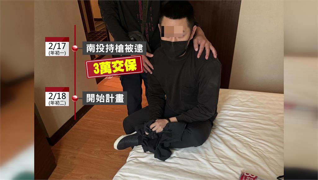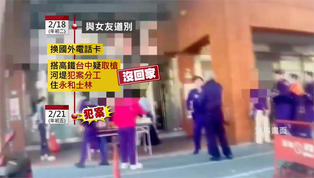 林嫌大年初一就因持槍被逮。圖/台視新聞槍枝被沒收,交保後林于翔跟女友道別,在大年初二重新計畫犯罪,換了外國電話卡,搭高鐵到台中疑似再度取槍,和共犯約在沒有監視器的河堤討論犯案流程,期間住在永和跟士林的旅館都沒有回家,直到大年初五他對著醫美診所負責人開槍犯案。