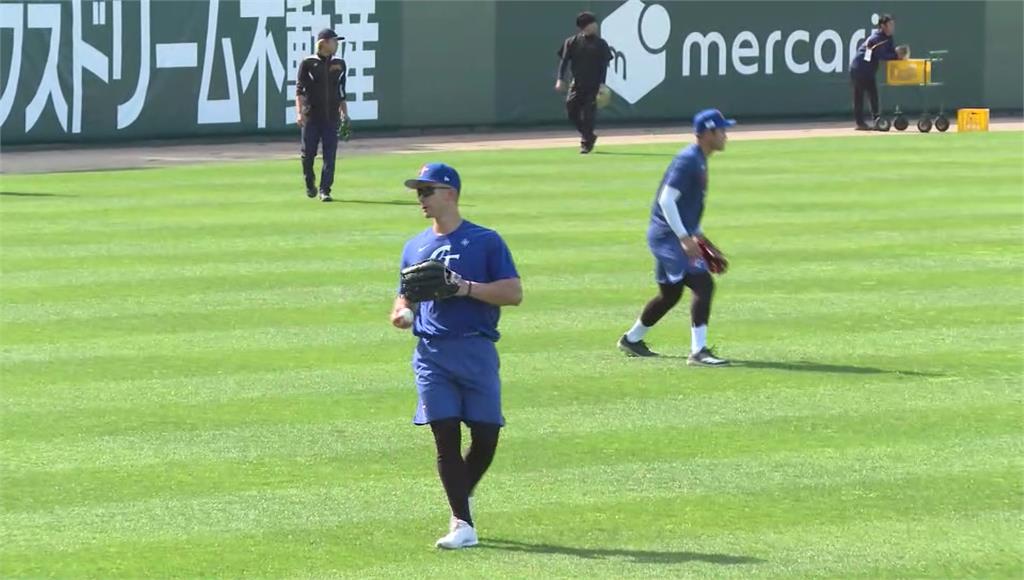 費仔與隊友加緊磨合。圖/台視新聞旅美投手林昱珉、林維恩與球隊會合後也進行傳接球與跑步熱身。不過,官辦熱身賽,比賽地點屬戶外黑土球場,球員還需適應時間,李灝宇也指出有點不習慣,「因為在美國都是有草,然後再紅土」。
