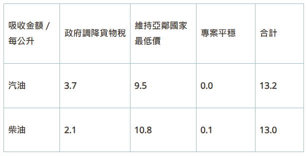 油價吸收金額表。圖/翻攝自中油官網責任編輯/蔡尚晉