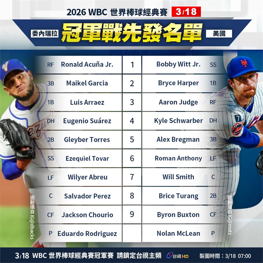 另外,兩隊先發打序也公布,委內瑞拉由昨天敲出帶有1分打點滾地球的Ronald Acuña Jr.扛起第一棒,第四棒則是昨天轟出陽春砲破蛋的Eugenio Suárez,期盼今天也能發威得分連線;美國方面則同樣是讓快腿Bobby Witt Jr.擔任開路先鋒,「法官」Aaron Judge第三棒、Kyle Schwarber第四棒力拚突破委國防守,《台視新聞》整理兩隊打序。